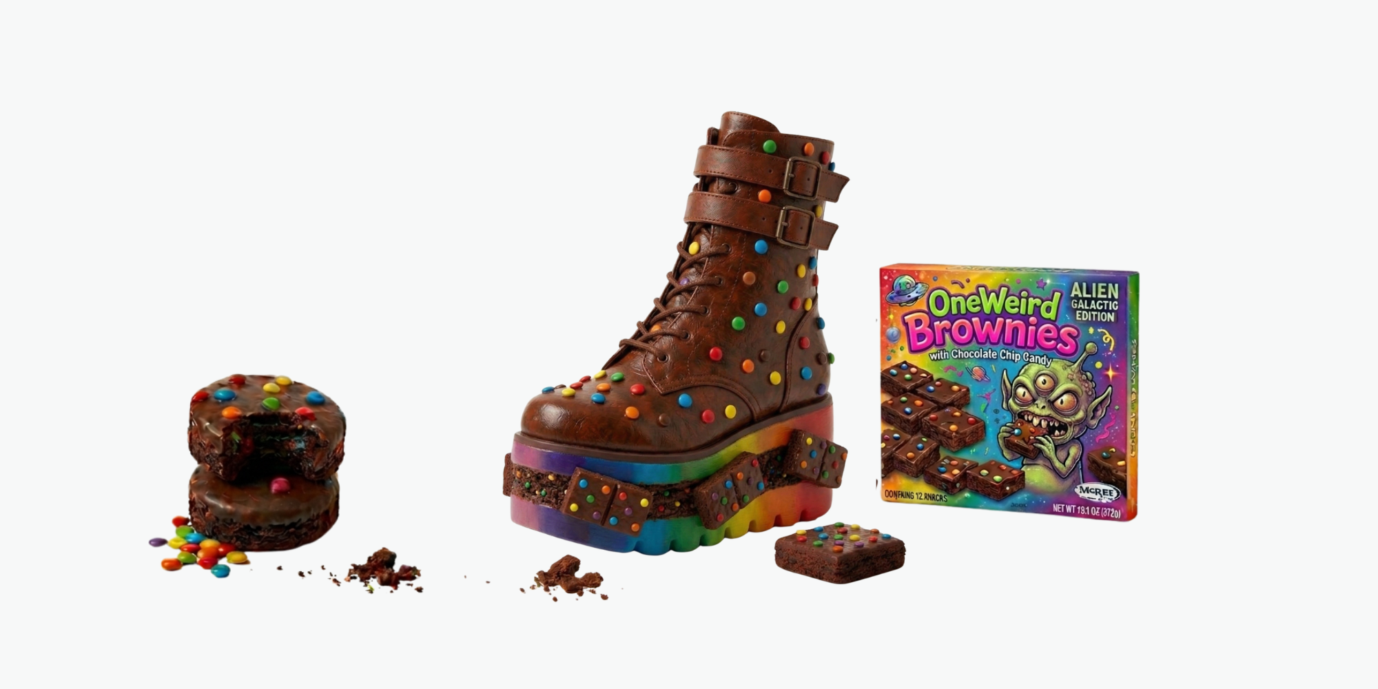 Breakfast is served... but it might bite back. These boots are a sugary-sweet nightmare, featuring a pastel pink and baby blue leather upper adorned with cereal-charm buckles. The real "crunch" is in the platform: a hyper-realistic gums-and-teeth sole "chewing" on a mix of rainbow cereal loops and fruit.